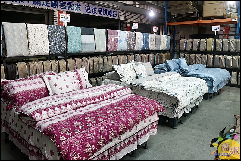 現場棉被超多,可以現場摸摸看材質,後方還有一整面百貨公司等級的被胎通通5折優惠價。