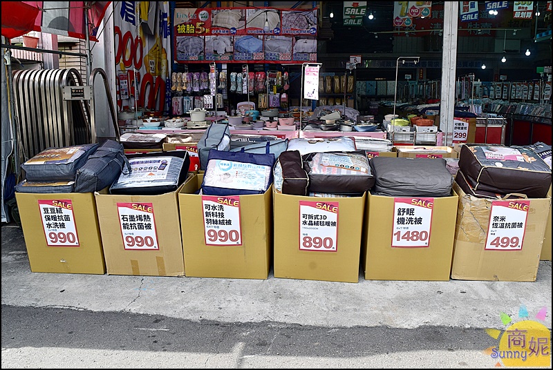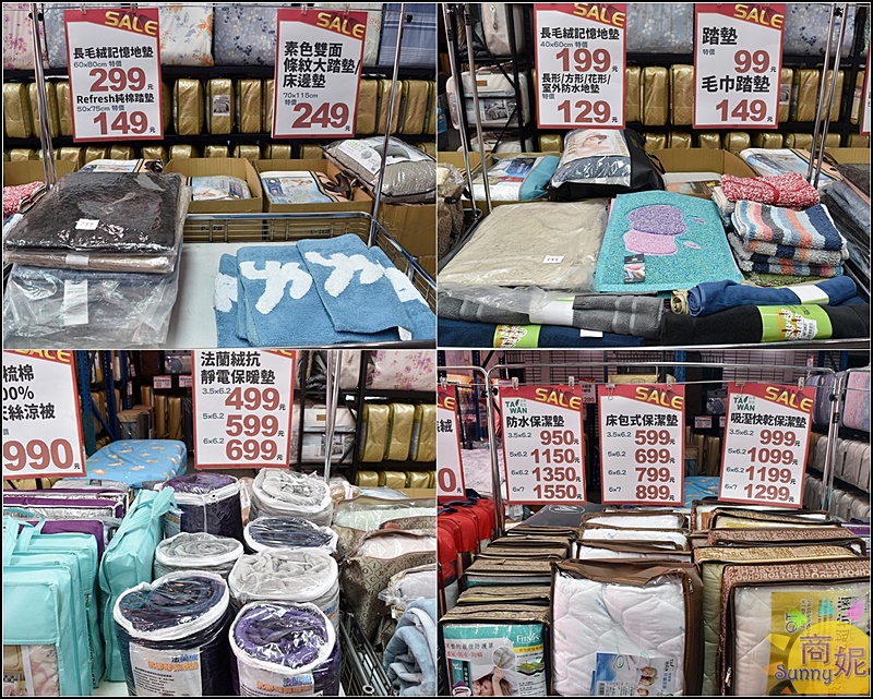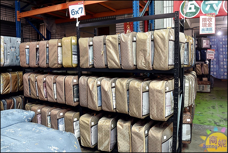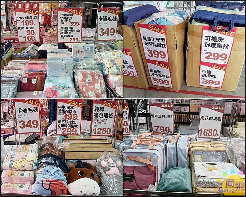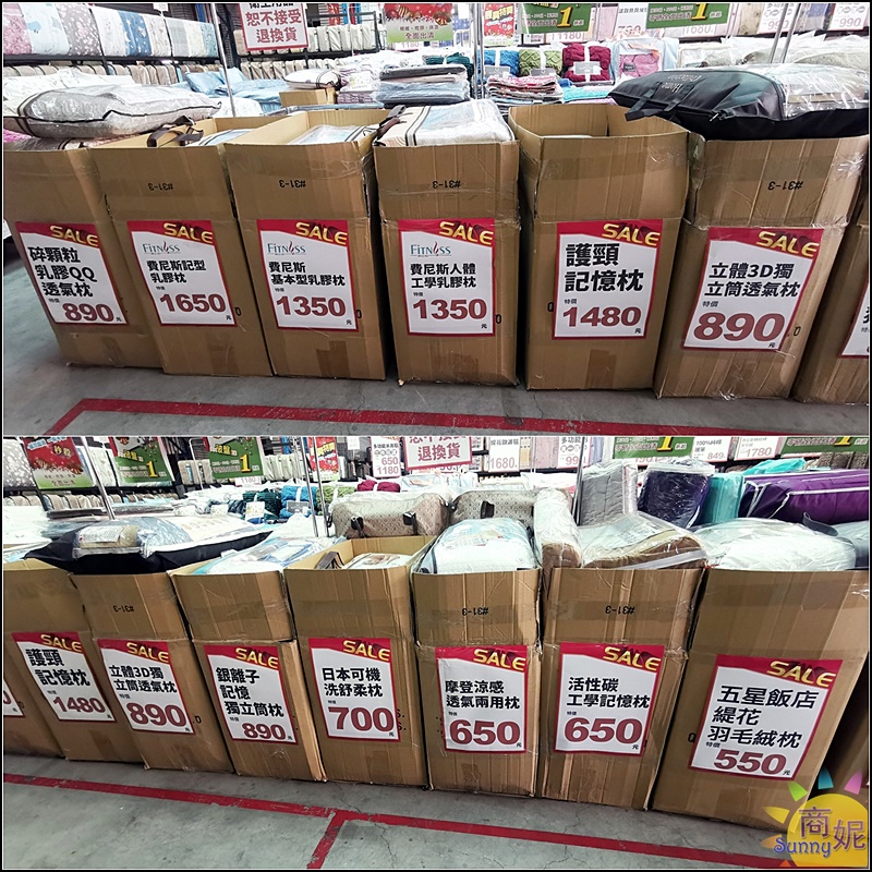 所有的寢具只要在運送過程或是展示期間有小瑕疵,統統集中到這一區便宜出清,上面都會註明瑕疵情形,可以接受再買。
