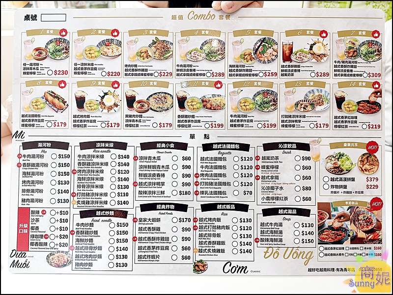 越好吃越南料理霧峰店菜單上種類很多,涼拌、熱炒、麵食、飯食、咖哩、鍋類、飲品…通通都有,有單點也有套餐組合,價格基本上都是百元出頭,免服務費,用餐不限時無低消規定。