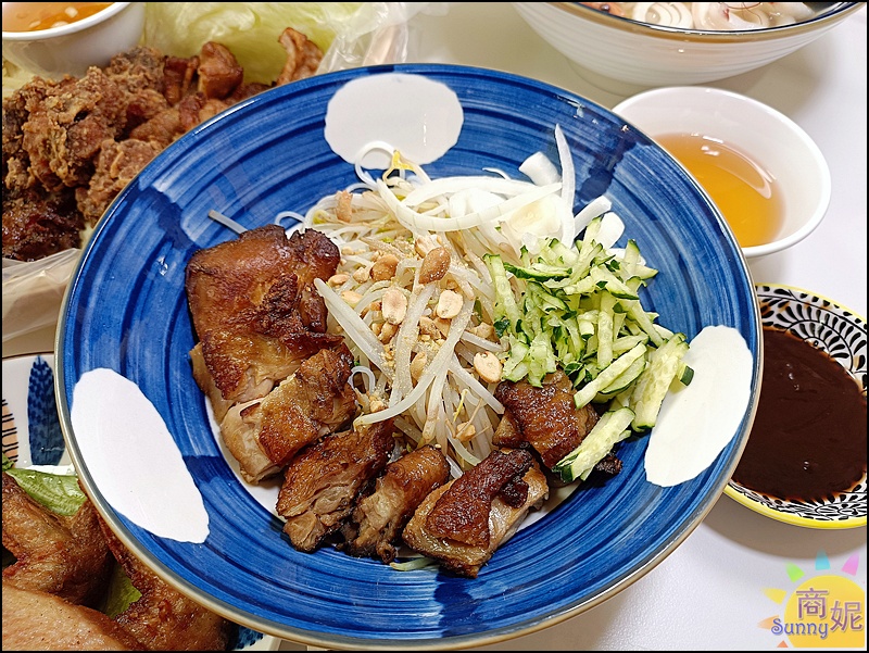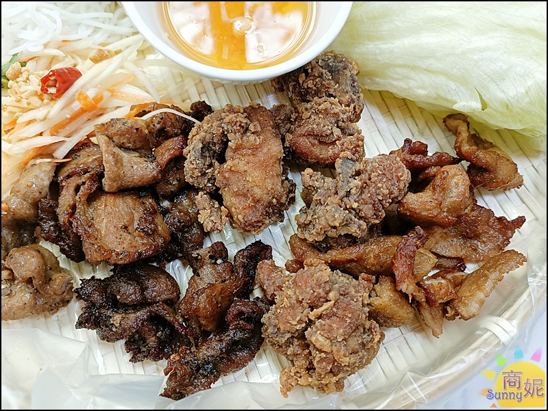 肉品份量超多,一共有越式香酥雞、越式炸排骨、越式烤豬肉3種,可以單吃也可以搭配旁邊的配菜一起包入生菜葉,自己隨意組合。