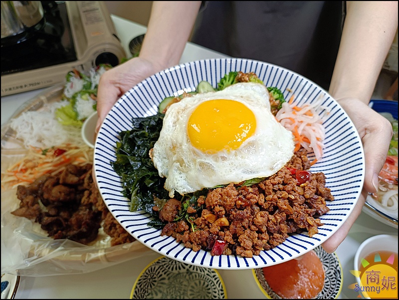這一道越南人平常吃的米食份量超多,除了大量的打拋豬肉,還有許多配菜。