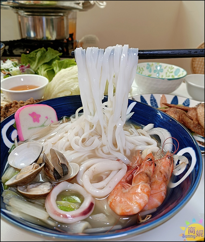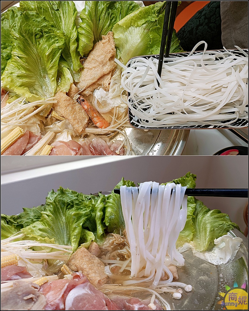 推推鍋湯底原本就有一些料,丸子、魚板、豆皮、金針菇、高麗菜、大陸妹,再加上肉片及海鮮越煮越甘甜,湯頭好好喝。