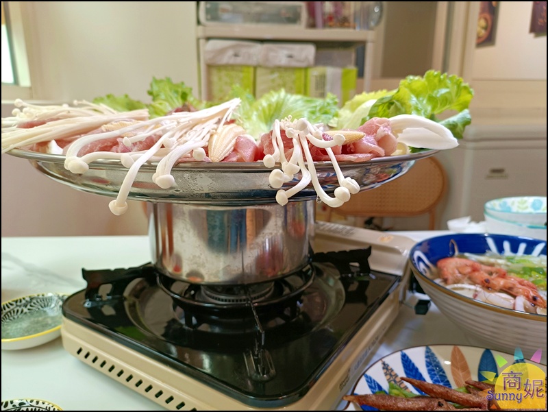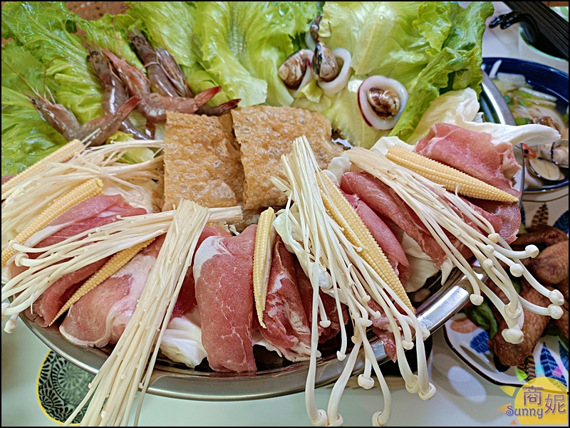 中間凹槽式火鍋湯底,外緣則是用大量的蔬菜及肉片、海鮮堆疊,整個畫面超吸睛!!