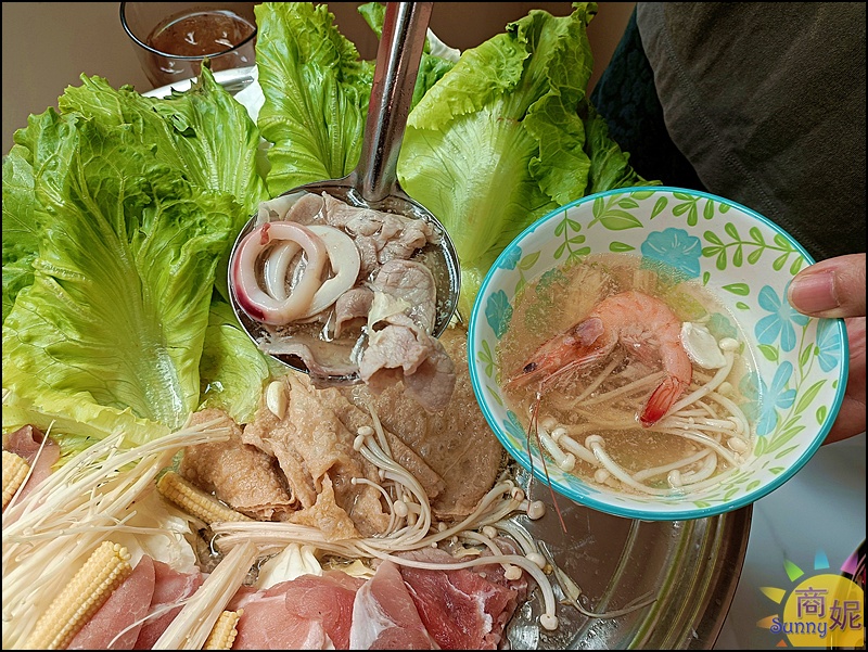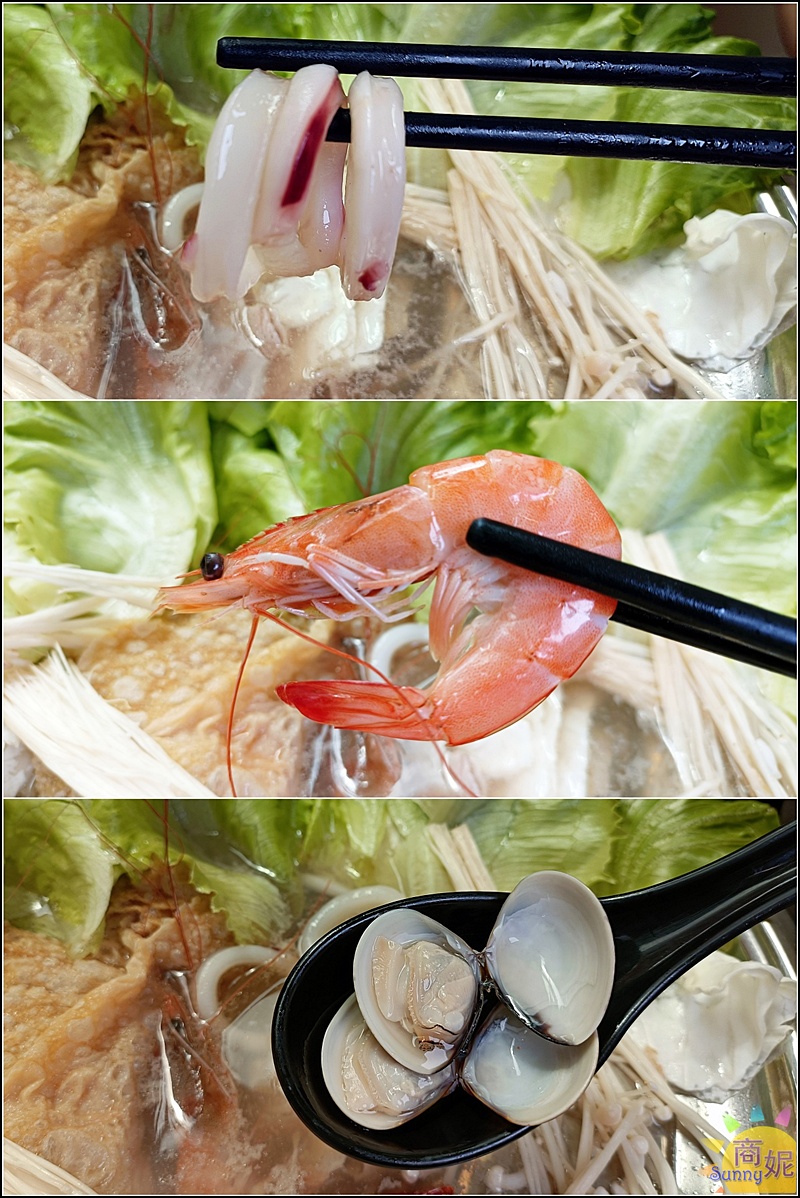 花枝、白蝦、蛤蜊,海鮮料推推下鍋,一邊推一邊煮充滿樂趣,湯底加上海鮮後味道更鮮甜!